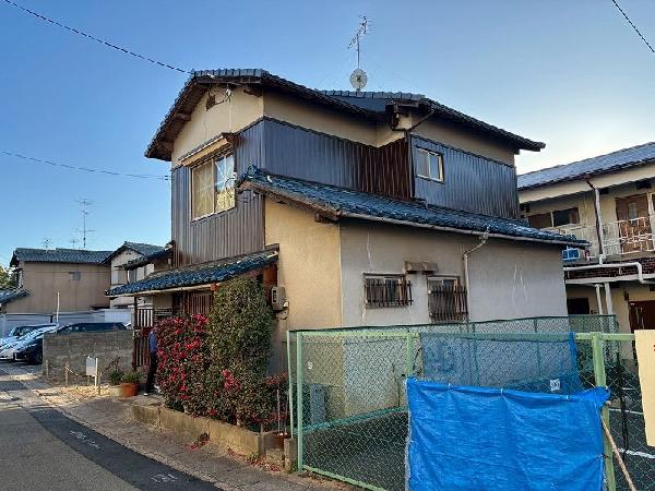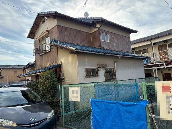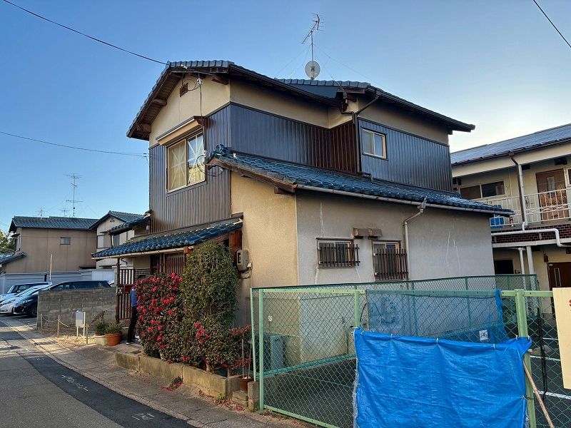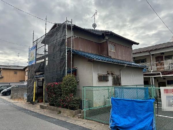 伏見区の居宅で外壁工事をさせていただきました。 二階部分が傷んでいたので、木目調プリント鉄板を貼らせていただきました。