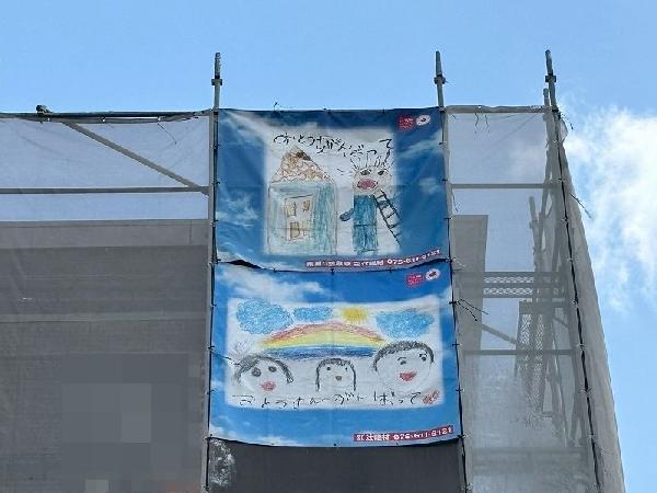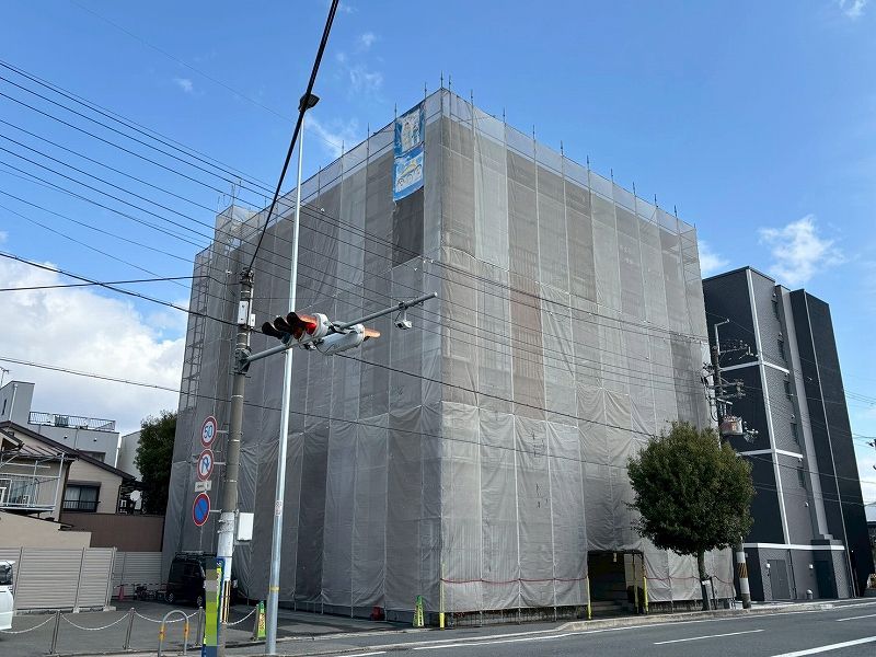 南区の会社で外壁改修工事をさせていただいています。 壁が大きいので、シートをダブルではりました。